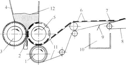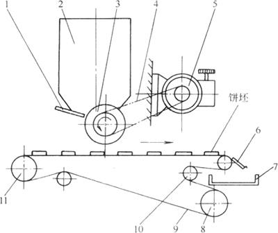 图3-3-5 辊印成形脱膜原理 1-脱模辊 2-分离刮刀 3-喂料辊 4-料斗 5-印模辊 6-饼干生坯 7、11-脱模带 8-生坯输送带 9-刮刀 10-面屑斗 12-面料 4.机构特点 该机的印花成形、脱模等操作,由成形脱模机构的辊筒转动一次完成,不产生边角余料,省去了余料输送带,使整机结构简单、紧凑,占地面积小,操作方便。机构工作连续平稳、无冲击、振动噪声小。 5.技术特征