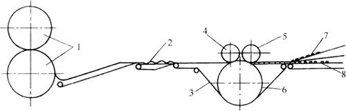图3-3-7 辊切成形原理示意图 1-定量辊 2-面带 3-脱模带 4-印辊 5-切辊 6-脱模辊 7-余料 8-生坯 4.机构特点 该机是综合了冲印饼干机与辊印饼干机的优点而发展起来的一种饼干成形机,具有广泛的适应性,速度快,效率高,振动噪声低。 5.技术特征