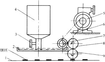 图3-3-8 刷蛋、乳机示意图 1-饼坯传送带 2-液料盘 3-流量控制阀 4-液料斗 5-电动机减速器 6-辊筒传动链条 7-上料辊 8-过渡辊 9-刷料辊 1.用途 主要用于饼坯表面涂刷蛋、乳。 2.组成 该机主要由液料装置系统(液料斗、液料盘、液量控制阀)、辊筒(上料辊、过渡辊、刷料辊)及传动带等部分组成。其动力可由成形设备传入,也可单配电动机和调速器以便根据不同的产品选择涂刷速度。 3.工作原理 工作时,上料辊7将液料盘2内的液料不断传给过渡辊8,最后均匀地被传到刷料辊9表面,刷料辊与通过传送带送进的饼坯表面接触,达到涂刷蛋、乳的目的。上料辊与过渡辊一般用金属材料制成,其中心距可调,这样可以控制液料的涂刷量。刷料辊一般用软质材料制成,刷料辊与饼坯的间距也可调,以保证涂刷和输送的质量。通过调节液料斗上控制阀来调节液料的流量,保证液料盘的一定液位高度。 4.机构特点 由于辊距可调,可控制液料的涂刷量,保证涂刷与输送的速度,提高产品质量。 (七)撒糖、盐机(图3-3-9)