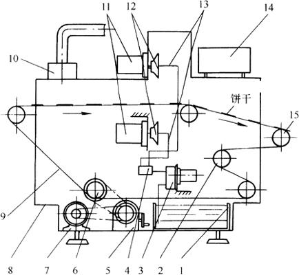 (b)原理图 图3-3-10 饼干喷油机 1-油箱 2-张紧辊筒 3-油泵 4-油压调节装置 5-变速器 6-网带驱动辊筒 7-电动机 8-机架 9-饼干输送网带 10-油雾回收装置 11-喷油电机 12-离心喷油轮 13-喷油输送管 14-电控箱 15-从动辊筒 1.用途 主要用来给烘焙出炉后的饼干表面喷涂上一层薄油雾面以提高饼干的色、香、味。 2.组成 该机由油箱、油泵、油压调节装置、离心喷油轮及输送网带等组成[见图3-3-10(a)]。 3.工作原理 工作时,经传动装置带动饼干输送网带回转,在输送网带的上、下方各并排安装有2台高速(>2000r/min)电动机,电动机轴上直接装有伞状离心喷油轮,食用油经油箱、油泵、调压分配器和开关电磁阀被送至离心喷油轮的中心而获得旋转运动。因离心力的作用,成薄膜状的油液以不断增长的速度向喷油轮边缘移动而喷出细的雾状,达到给饼干的面、底表面喷上油雾的目的。喷油层饼干蒸发的油雾通过油雾回收装置中的离心式风机吸回,再喷到刚进机的饼干上,这样循环利用,减少了油耗。 4.机构特点 该机为油盘高速离心甩油式喷油机,雾化好,较双轴滚动式和喷油嘴式先进理想,油量无级调节,油温从0~40℃任意选择并自动控温,油经水间接加热。它是提高饼干色香味不可缺少的设备。 (九)集油网带机(图3-3-11)