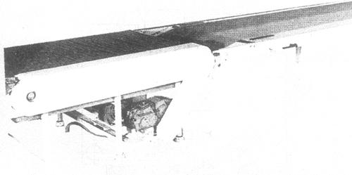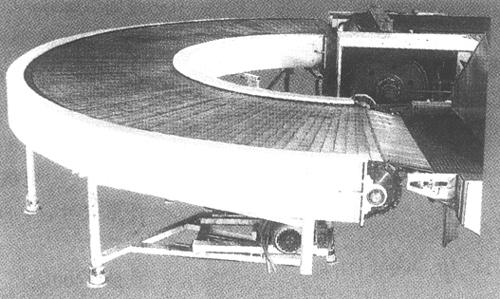 图3-3-17 冷却输送带 1.用途 该机用于饼干的冷却、输送,使饼干经一段时间运行自然冷却,以便转入理饼机或包装台工序。 2.机构特点 该机冷却带形式有水平、倾斜与重叠三种。 冷却带的长短,由用户根据场地和需要来确定,可灵活掌握。 (十六)输送带转换机(图3-3-18)