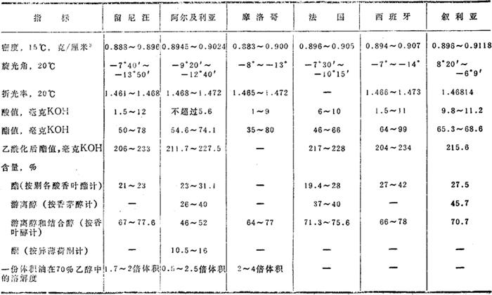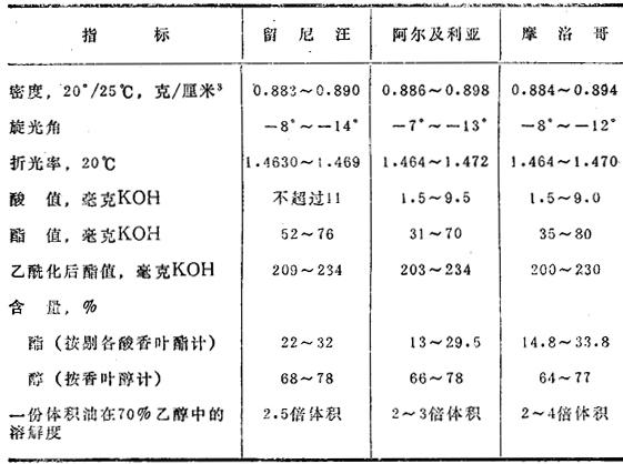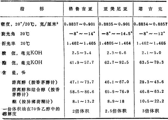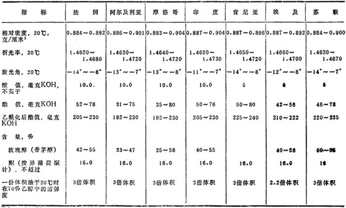 苏联自整株新鲜的玫瑰天竺葵(P.roseum)里所得到的香叶油的性质见表13.4。 表13.4 苏联各加盟共和国产的香叶油物理化学指标