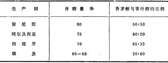 *游离醇含量按香叶醇计 关于不同产地香叶油的含醇量,以及在醇混合物中香茅醇与香叶醇之间的比例见表13.3. 表13.3 香叶油的含醇量及香茅醇与香叶醇的比例