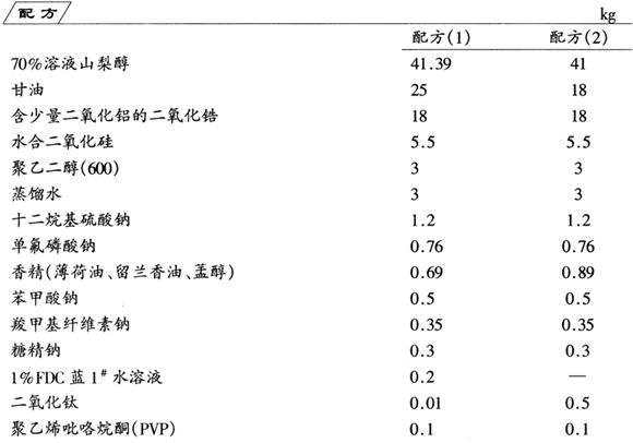 分别对配方(1)、配方(2)按配比采用湿法溶胶制膏工艺,将全部物料混合,在捏合机内,充分捏合,成为膏状体,制成香味稳定的2种牙膏。