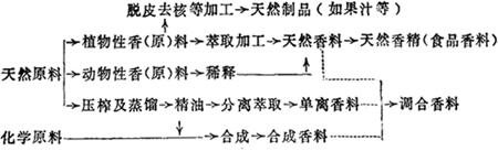 | 释义 | 香料 香料一般分为天然香料和人造香料两大类。天然香料又分为植物香料和动物香料两类。人造香料通常指含有一种芳香成分的单体香料,包括单离香料和合成香料。 1.香料的种类和制法(图16-10)