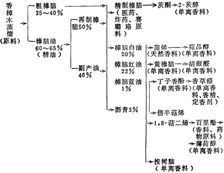 图16-11 香樟木的加工产品示意图 2)动物性天然香料 主要有麝香、灵猫香、龙涎香、海狸香等,麝香是雄性麝鹿生殖腺的分泌物,干燥后呈红棕色至暗棕色的粒状物质,具有不愉快的原始香气,但在高度稀释后具有独特的香气,主要成分为麝香酮,定香力很高。灵猫香是其生殖腺的分泌物,似脂肪的淡黄色或褐色半流体,也具有不愉快的原始香气,经高度稀释后具有独特的香气,主要成分为灵猫酮。龙涎香是抹香鲸肠胃的疾病分泌物,为黄色、灰色或黑色蜡状物,主要成分为龙涎香素(复杂的萜醇),有独特的香气。海狸香是海狸生殖腺的分腺物,新鲜时为奶油状,干后成红棕色的树脂状物质。上述这些香料用于配制高级化妆品和香精等。 3.人造香料 1)以煤焦油化工产品为原料的合成香料 (1)苯和环氧乙烷在三氯化铝的催化作用下合成苯乙醇(玫瑰香)。 (2)以甲苯为起始原料,可合成多种香料,如乙酸苄酯(茉莉香)、苯乙酸(密香)、苯甲醛(杏仁香)、桂醛(桂皮香)、桂醇(花香)。 (3)其他还可合成为山楂香、风信子香、麝香草酚(百里酚)等。 2)香精剂型 醇溶型香料、油溶型香精、乳液型香精、粉剂香精。 |