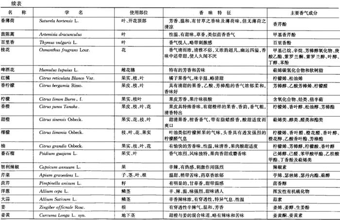 (三)主要香料植物及其特征香味和主要香气成分 主要香料植物含香部位、香味特征和主要香气成分见表1-4-18。 表1-4-18 主要香料植物及其香味特征和主要香气成分