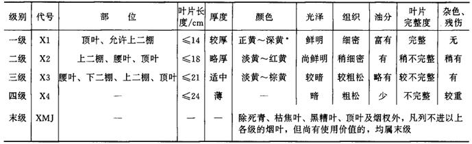 | 释义 | 香料烟分级 (一)国外香料烟分级 各国的香料烟分级标准均有所不同,但分级原理是一致的,即不分组,只分级。分级时从烟株由下而上,越近顶部烟叶,等级越高。分级因素选用部位、叶片大小、色泽、组织、弹性、香气、叶片完整度、斑点和损伤度等。 1.土耳其香料烟出口标准 香料烟分为四个等级。 一级(AG):包括顶叶至下部为二棚叶,叶片为小至中等,本型色为鲜明至尚鲜明。组织细密、有弹性。具有完全或部分的本型香气,叶片完整或稍不完整,无斑点和损伤。 二级(BG):包括下二棚叶和近腰叶;部分底叶和列不进一级的叶片。叶片为小、中等和大的。属本型颜色,组织细密和稍细密,中性型或芳香型。叶片完整或稍不完整,稍有损伤。 三级(KP):包括底脚叶,1,2级列不进去的叶片,叶片为小、中等和大的,颜色为混色和含青。组织稍细密和脆弱,香气无要求。形状为完整和稍不完整。稍有斑点和损伤的脚叶及其他在采收中具有的斑点和损伤烟叶。 四级(DKP):包括1,2,3级列不进去的全部叶片,叶片大小无要求,混色、青的或暗青叶,组织无要求,叶片完整或不完整,有严重损伤的烟叶。 2.希腊香料烟分级标准简介 希腊香料烟分级标准是依据烟叶的颜色、部位和外观特征所表现出的物理特性以及烟叶品质依次划分为以下5个等级。 一级:烟株顶部较薄的完整叶,叶色黄至橘红色,组织疏松,弹性强,香气足,燃烧性好,叶片长度3~7cm。 二级:除顶叶外,还包括有第3至第4次采摘叶,烟叶质量特性与一级烟相同,叶片长度等于或小于15cm。 三级:第1至第2次采摘叶,还包括其他部位有轻微病虫、调制残伤以及含青的叶片,组织疏松,有弹性,叶片长度为15~20cm。 四级:包括各部位的烟叶,2/3以上烟叶的叶面有病虫害残伤、青色、棕色斑块,叶片较厚,稍有或无弹性,叶片长度不限。 五级:包括死青、棕色和有大面积病虫害残伤以及调制灼伤的烟叶,叶片长度不限。 通常将1,2,3级香料烟烟叶混在一起,称1/3级。对不同品种的1/3级烟叶内,1,2级烟叶所占百分比有一定要求。如对巴斯马品种,要求在1/3级烟叶内,其1,2级烟叶必须达到55%。对沙姆逊和卡巴库拉克品种的1/3级烟叶内,其1,2级烟叶必须占53%。 (二)我国香料烟分级标准 我国香料烟分级标准不分组,以部位为首要分级因素,叶片长度起有主要作用,结合烟叶厚度、颜色、光泽、组织结构、油分等品质因素,将烟叶分为1~4个等级和末级。对上、中等烟叶的各项因素规定明确;对下等烟叶主要侧重于鉴定叶片的完整度、杂色、残伤等控制因素。这是根据香料烟本身的品质特性和工业使用要求而考虑的。 我国香料烟叶国家分级标准(GB5991-86)简列,见表4-3-5。 表4-3-5 我国香料烟国家分级标准简列