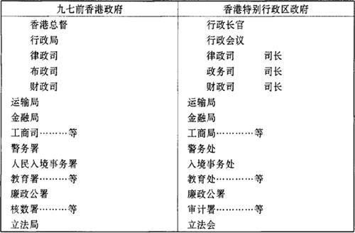 | 释义 | 香港特别行政区行政机关 基本法第59条、第60条和第64条规定:香港特别行政区政府是特别行政区行政机关,特别行政区政府的首长是特区行政长官,特别行政区政府要向立法机关负责。这些条款对香港特别行政区行政机关的性质和法律地位作了明确规定。就行政机关的定义而言,有广义及狭义之分。广义的行政机关包括行政长官、行政会议和各行政部门;狭义的行政机关仅指行政部门。基本法第四章第二节所规定的“行政机关”是狭义上的行政机关。行政长官和行政会议的内容则在“行政长官”一节中加以规定。 有关香港特别行政区行政机关的组成、机构的设置,基本法都作了明确的规定。基本法第60条规定,行政长官是特区政府的首长,特区政府设政务司、财政司、律政司和各局、处、署。这就确定了香港特别行政区政府的组织机构:政务司、财政司、律政司,是行政机关中的三个主要机构,分别掌管政务、财政、律政等政府事务,其负责人称为“司长”;“局”为有拟定政策权力的部门,如工商局、金融局;“处”为负责执行行政事务而不拟定政策的部门,如警务处、入境事务处;“署”为工作较有独立性质的部门,如廉政公署、审计署。司、局、处、署的负责人,即各司司长、副司长,各局局长,廉政专员,审计署署长,警务处处长,入境事务处处长,海关关长,是行政机关中的主要官员,一般应从公务员中挑选,但也可以从公务员以外的社会人士中挑选,后者担任主要官员期间,按合约公务员待遇,任满后即脱离公职。 从特区政府的组成来看,基本法为了保持香港的繁荣、稳定和平稳过渡,尽可能地保持了类似九七前香港以布政司为首的行政机关体制。所不同的在于,特区行政长官同时又是政府首长;布政司改称为政务司,因为“布政司”是清朝时代的官职名称,辛亥革命以后就已不再沿用。由于保留了三个大司的“司”的名称,为区别三大司与其他“司”的不同地位,基本法将其他“司”的名称改为局,局的地位与现在的“司”及《中英联合声明》中提及的“司级”仍相同。(见下表)