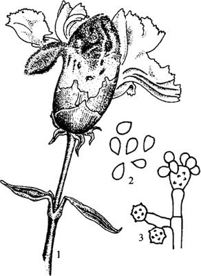 图5-32 香石竹灰霉病 1.症状 2.分生孢子 3.分生孢子梗 【发病规律】 病菌以菌核越冬。气温20℃左右,湿度高时,易传播发病。塑料棚比玻璃暖房发病重;组织培养苗比扦插苗抗病。黄花品种比红花品种发病重。 【防治方法】 (1)栽培防治。注意通风,降低湿度,避免浇水不当及他处漏水流入栽植地。发现零星病株,及时清除。 (2)药剂防治。可选喷75%百菌清500倍液,或50%扑海因可湿性粉剂1000~1500倍液,或50%农利灵可湿性粉剂800~1000倍液,每隔10~15天喷1次,连续喷2~3次。注意多种药剂交替使用,避免产生抗药性。 |