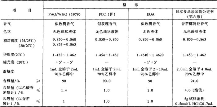 C10H20O 相对分子质量 156.27 性状 无色油状液体,沸点225℃,闪点98℃。微溶于水,不溶于甘油,溶于乙醇。与天然、合成香料互溶,溶于丙二醇。 制法 由富含香茅醇的精油(如香叶油)中分离得到,或由香叶醇氢化得到。 质量标准