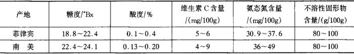 香蕉果面有灰、淡黄、橙黄和紫红等色调,其甜味、香气和风味各不相同。加工用的香蕉对品种没有特殊要求,当果实还是绿色时就被采收,追熟至果皮呈均匀黄色、有芳香味后作为原料。绿色香蕉是硬的、淀粉质的。在成熟过程中,香蕉组织逐渐变软,颜色从绿色变为黄色,淀粉逐步转化为糖。采收时香蕉含糖量1%~2%,淀粉含量19.5%~ 21.5%,而成熟时其含糖量增至16.5%~19.5%,淀粉降至1.0%~3.0%。在追熟过程中,放出少量乙烯气和挥发性酯类,产生愉快的香味,变得甜而可口。香蕉果肉组织极易发生褐变,因此加工香蕉最好在无氧状态而且在酶失去活力的温度下进行。 (二)香蕉浆生产技术 香蕉具有以乙酸戊酯系香气成分为主的迷人芳香。香蕉一般是以香蕉浆(香蕉泥)的形态作为果肉型饮料的基料。香蕉浆的主要规格见表2-1-66。 表2-1-66 香蕉浆主要规格
