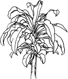 图2-133 香龙血树 (1)植物学特征。香龙血树,龙舌兰科,龙血树属,常绿乔木。茎粗肥大,灰褐色,圆柱形,多分枝,叶剑形,聚生于茎或分枝上。叶片中央镶着很宽的金黄色纵条纹。边缘为绿色。栽培品种有金边香龙血树、银边香龙血树、金心香龙血树等。 (2)对环境与土壤的要求。龙血树喜温暖、阳光、畏寒、耐干旱,好生于湿润的环境和疏松、肥沃、排水良好的砂质土壤。盆栽可用园土加20%的砂拌和后使用。并加适量骨粉作基肥。 (3)施肥技术。生长旺季可每月追施1次以氮、磷、钾结合的薄液肥。如施氮肥过多时,植株会徒长,叶条纹会退色,因此,施肥以复合肥料为好。 |