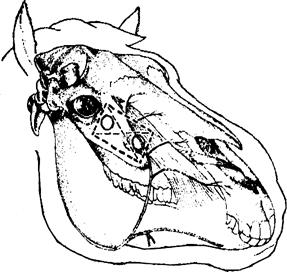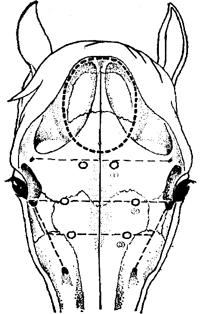 | 释义 | 马副鼻窦圆锯术 【适应症】副鼻窦化脓性炎症经保守疗法无效;除去副鼻窦内肿瘤、寄生虫、异物等;牙齿打出术时的手术径路等。 【保定】柱栏内保定,确实固定头部。 【麻醉】局部浸润麻醉,但齿源性上颌窦炎需作牙齿打出术者,则应全身麻醉,侧卧保定。少数烈性马可用少量水合氯醛加以镇静。 【术部】 1.额窦圆锯部位的确定(图2-13) 1)额窦后部 在两侧额骨颧突后缘作一连线与额骨中央线(头正中线)相交,在交点两侧1.5~2cm处为左右圆锯的正切点。 2)额窦中部 在两内眼角之间作一连线与头正中线相交,交点与内眼角间连线的中点即为圆锯部位。 3)鼻甲部额窦前部 由眶下孔上角至眼前缘作一连线,由此线中点再向头正中线作一垂直线,取其垂线中点为圆锯孔中心。在额窦蓄脓时,此圆锯孔便于排脓引流。