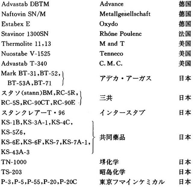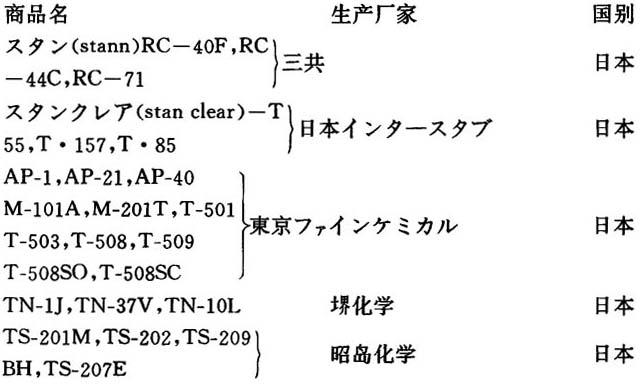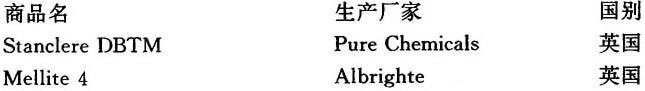为了进一步改进加工性能,国外还生产许多液体马来酸二丁基锡,这些品种多为淡黄色透明液体,无臭,有润滑性,适用于挤塑和注塑成型品、中空成型品。液体马来酸二丁基锡的主要商品如下。