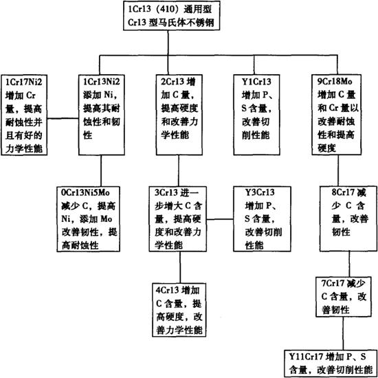 | 释义 | 马氏体不锈钢 马氏体不锈钢是一类可通过热处理(淬火回火)对其性能进行调整的不锈钢,通俗地讲是一类可硬化的不锈钢,此类钢具有高的硬度、良好的力学性能和不锈性,这些特性决定了此类钢必须具备两个基本条件:其一,在平衡相图中必须有奥氏体相区存在;其二,为使钢形成耐腐蚀的钝化膜,铬含量必须在10.5%以上。根据钢中合金元素的差别,可将马氏体不锈钢区分为马氏体铬不锈钢和马氏体铬镍不锈钢。在马氏体铬不锈钢中又可划分成低碳、中碳和高碳三种类型。马氏体不锈钢在淬火状态下具有体心四方(bct)晶体结构(马氏体),具有铁磁性,在较弱腐蚀环境中具有耐蚀性。钢中的铬含量可达18%,碳可以超过1.2%。为了提高钢的耐腐性和刃具的锋利度,组织中允许存在过剩碳化物,为了改善淬火后的回火效应,可适当加入铌、硅、钨和钒。含镍马氏体不锈钢改善了铬马氏体不锈钢在某些介质中的耐蚀性和提高了钢的韧性。马氏体不锈钢中的碳是不可缺少的重要元素,它使Fe-Cr二元合金形成γ相区且决定了钢在淬火状态下马氏体的硬度。大量试验表明,0.10%C的马氏体的硬度值大约为35HRC,0.5%C的马氏体其硬度值可超过60HRC,再高的碳其硬度值未见明显变化。 我国标准中(GB1220-92)共列入18个马氏体不锈钢牌号,基本是13%Cr和17%Cr的两种类型,为了赋予钢的其他特性派生出一些改进型牌号,马氏体不锈钢的发展网络见图3-1。