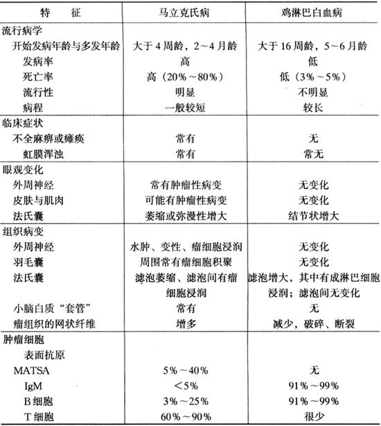 | 释义 | 马立克氏病 马立克氏病是由疱疹病毒引起鸡的一种高度接触传染性、淋巴组织增生性疾病。以外周神经、性腺、各内脏器官、虹膜、肌肉和皮肤的单独或多发的(单核)淋巴细胞增生浸润和肿瘤形成为特征。 由于病毒能引起淋巴细胞的溶细胞感染及破坏法氏囊、胸腺、脾脏等免疫器官,引起严重免疫抑制,影响各种疫苗的预防效果,使患鸡对鸡白痢、球虫、新城疫等病的感染率增高。本病在全世界所有养鸡国家均有发生,造成的经济损失极为严重。1973年我国首次发现本病。 一、诊断要点 (一)临床表现 本病是一种肿瘤性疾病,自然感染的潜伏期因受病毒株、剂量、年龄、品种等多种因素的影响,一般短到3~4周,长至数月。人工感染1日龄雏鸡,2~3周龄开始排毒,3~4周龄出现症状。MD临床表现与MDV的毒力有关,根据病变发生的主要部位和临床症状,可将本病分为急性和慢性两大类,而慢性又可分为神经型(古典型)、内脏型、眼型和皮肤型。 1.神经型(古典型) 这种类型是由毒力较弱的毒株侵害神经系统引起,外周神经、腹腔神经、坐骨神经和臂神经最易受到侵害。病鸡的第一个可见症状是运动失调或步态拘谨。由于病鸡受侵害的神经不同,所表现的症状变化很大。臂神经受侵害时表现为受害侧的翅下垂,以侵害坐骨神经引起腿麻痹最为常见,常表现一侧较重一侧较轻。发生不全麻痹时,病鸡步行不稳,如完全麻痹时,不能站立,而蹲伏地上,出现一只腿向前伸,另一只腿向后伸的特征性“劈叉”姿势。在单侧麻痹时,以手触诊可以察觉麻痹腿的温度要低于另一侧;支配颈肌的神经受到侵害时,表现为低头甚至歪颈。植物神经受侵害时,可以引起嗉囊麻痹或扩张、呼吸困难、腹泻、消瘦、贫血等症状。本型病程较长,最后因采食困难,饥饿、脱水、消瘦,衰竭而死亡。 2.内脏型 该型由强毒力病毒引起,常侵害幼龄鸡,死亡率高。流行开始时病鸡表现高度沉郁,食欲减退,被毛粗乱,有的病鸡离群呆立一旁,头颈收缩呈企鹅样站立姿势。经数天后,部分病鸡可表现共济失调,蹲卧,接着出现腿或翅一侧性(或两侧性)轻瘫或麻痹。有的病鸡不表现明显的症状,只表现消瘦,最后衰竭死亡。剖检大量病死鸡发现,几乎所有内脏器官均发生肿瘤病变,但发生的几率是不同的,肝脏、脾脏、卵巢最易受侵害,重者卵巢正常结构消失,整个卵巢呈菜花状。 3.眼型 一眼或两眼同时发病,主要侵害虹膜,轻者对光反应迟钝,重者失明。虹膜的正常色素消失,呈同心环状或弥漫性的灰白色,俗称“灰眼”或“银眼”。瞳孔缩小,边缘不整齐(锯齿状),视力减退,严重时整个瞳孔只留下一个针尖大的小孔。有的可在眼部形成肿瘤。 4.皮肤型 无明显临床症状,只在毛囊处因淋巴细胞性增生形成小结节状或瘤状物,多个毛囊常融合在一起。肉鸡表现毛囊粗大,皮肤粗糙,并且生长迟缓。严重者皮肤结节呈淡白色,有时形成疥癣样表面,并有褐色痂皮。以上病变常见于大腿、颈部及躯干背面有粗大羽毛的部位。 5.急性型 主要见于6~12周龄的幼鸡,发病急,死亡率高,无特异症状。突然暴发,迅猛流行,病程短促。常见不到(外周)神经麻痹,有时会出现内脏器官淋巴瘤。死亡率较高。 (二)病理剖检 1.急性型 性腺、肝、脾、肾、胰、腺胃、肺、心、法氏囊、肠系膜、皮肤、骨骼肌、肾上腺、胸腺等很多器官组织受害。而外周神经的病变则相当少。有时可见到眼的病变。此型病变和鸡淋巴白血病十分相似,也表现为肿瘤性结节或器官弥漫性增大。结节状病变表现为器官表面或实质有灰白色肿瘤结节,其数量不一,大小不等,结节切面呈均匀灰白色。弥漫性病变时器官弥漫性增大,色彩变淡。卵巢常显着增大,呈瘤团状,表面不光滑。公鸡睾丸常一侧肿大,质软。腺胃和肠管表现管壁增厚、坚实,有时腺胃内壁出现“火山口”样溃疡,严重时会导致穿孔。肠系膜也可见肿瘤组织生长。胸肌和大腿部肌肉出现灰白色条纹或结节。皮肤则表现毛囊肿大呈小结节状,严重时局部形成褐色痂皮,也可出现较大的肿瘤结节,有时其中央破溃,长羽毛髓端有羽髓处呈S状弯曲或呈葫芦状变形。带眼受害时瞳孔缩小,边缘不齐,虹膜褪色,呈灰白色。腔上囊缩小。病变可能仅在一个器官或波及数个器官,有时仅神经受侵害。这种情况和毒株对不同组织的嗜性有关。 2.慢性型(古典型、神经型) 多见于3~5月龄的幼鸡,病程较长,生前有神经症状。病变见于一处或多处外周神经与脊神经节。其中常发部位是腹腔神经丛、腰荐神经丛、臂神经丛、坐骨神经和内脏大神经,多为单侧神经受害。眼观,病变部位神经不均匀地粗肿,色灰白或淡黄,正常纹理消失;有时水肿明显,呈半透明状;有时呈结节状,质软,色灰白。如神经节受害则其肿大呈灰白色结节状。20%~30%的病例,卵巢或睾丸有肿瘤性病变,因滤泡间肿瘤细胞分布而呈弥漫性增厚,其体积增大,呈结节状、菜花状,坚实且硬。 组织学变化:不论急性或慢性型,病变组织器官的血管周围有淋巴细胞(小、中、大型)、成淋巴细胞、浆细胞、组织细胞等多形态的细胞增生浸润,但内脏器官的肿瘤组织中很少有浆细胞,同时还有变性的成淋巴细胞(即马立克氏病细胞)。马立克氏病细胞的个体很大,胞浆嗜碱性和嗜派若宁性,常有空泡,核浓染,形状不定。瘤细胞中可见到核分裂象。肿瘤组织的嗜银纤维增多,呈丝网状分布。 外周