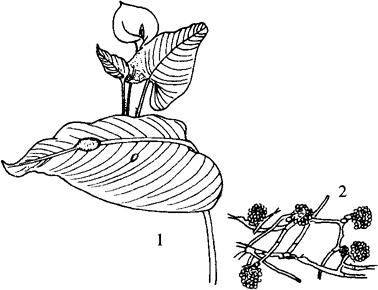 图5-76 马蹄莲叶斑病 1.症状 2.菌核 【病原】 叶点霉Phyllosticta richardiae Hals.其他2种病原菌为尾孢菌Cercospora richardiaecola及盘长孢菌Gloeosporium callae。 【防治方法】 (1)及时清除病叶残茎,避免过度供水。不要直接向植株浇灌。 (2)发病时喷25%敌力脱乳油1000~1500倍液,或80%大生500倍液,隔7~10天喷1次,连续2~3次。 |