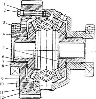 图3-10 中央传动类型 a.链传动 b.外啮合圆柱齿轮传动 c.螺旋圆锥齿轮传动 2.功用 (1)将变速器传来的动力传给差速器。 (2)因中央传动的主动齿轮直径小于从动齿轮直径,具有大于1的传动比,所以起减速增扭作用。 (3)当发动机在机车上纵向安置时,采用锥齿轮传动的中央传动,将作用在横向平面的扭矩转变到纵向平面,与驱动轮旋转平面一致。 (二)差速器 1.功用 (1)将中央传动传来的动力平均分给左右半轴。 (2)允许左右车轮以不同的速度旋转。 2.构造 差速器由差速器壳、行星齿轮、行星齿轮轴和左右半轴齿轮组成,如图3-11所示。行星齿轮套装在行星齿轮轴上,行星齿轮轴与差速器壳紧配合在一起,中央传动的从动齿轮通过螺钉与差速壳相连接。