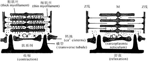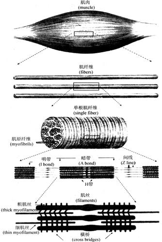 | 释义 | 骨骼肌的收缩与舒张 一块骨骼肌由许多肌纤维组成,每条肌纤维又由许多条肌原纤维(myofibril)组成,而每条肌原纤维则由许多个分子的肌凝蛋白(myosin)组成的粗肌丝和由肌动蛋白(actin)、原肌凝蛋白(tropomyosin)以及肌钙蛋白(troponin)组成的细肌丝组成。通常人体骨骼肌的收缩都是在神经支配下完成的。当运动神经的冲动传递至肌细胞后,引起肌细胞兴奋,并发生张力的增加和长度的缩短,称为肌细胞收缩(contration)。随后肌细胞恢复到原来的状态,即肌细胞舒张(relaxation)。 (一)骨骼肌收缩的原理 20世纪50年代,Huxley等就提出了肌丝的滑动理论(sliding theory)。该学说认为在肌丝收缩时并不是由于肌丝的卷曲或缩短而引起的形态变化,而是细肌丝向粗肌丝之间的滑动,使肌节缩短,从而使整个肌细胞及整块肌肉收缩(图4-11)。近年来,滑行学说得到进一步的发展。一条粗肌丝约含有260个肌凝蛋白分子,每个肌凝蛋白分子分为头和杆两部分,杆部朝向M线呈束状排列,头部则规律的分布在粗肌丝表面,形成横桥(图4-12)。细肌丝直径只有粗肌丝一半。肌丝滑行的始动因素是肌膜产生动作电位后,动作电位沿肌膜迅速扩布,并由横管膜传至终末池,使终末池膜上的钙通道开放,终末池中的Ca2+顺浓度梯度经钙通道扩散入肌浆,并到达细肌丝与肌钙蛋白结合,使肌钙蛋白分子发生变构,相继引起原肌凝蛋白的双螺旋结构也发生变构和扭转,从而暴露了肌动蛋白上的结合位点,并使之与粗肌丝上的横桥结合。这种结合可激活横桥上的ATP酶,使ATP分解并释放能量,引起横桥向M线方向摆动,将细肌丝往粗肌丝方向滑动,使肌节缩短而完成肌肉的收缩活动。当肌浆中的Ca2+浓度降低时,横桥与肌纤蛋白解离复位,细肌丝又恢复成原来的状态,肌细胞即处于舒张状态。