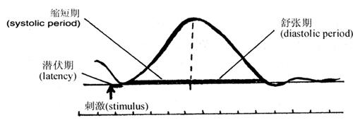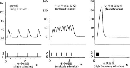 图4-13 肌肉的单收缩曲线 在肌肉接受连续的刺激时,若后一个刺激落在前一个刺激引起的单收缩的缩短期内,后一个刺激引起的单收缩就会在前一个单收缩的缩短期中叠加起来形成收缩的复合,产生完全强直收缩(complete tetanus);若后一个刺激落在前一个单收缩的舒张期,则后一个刺激引起的单收缩会在前一个单收缩的舒张期发生叠加,形成不完全强直收缩(incomplete tetanus)。完全强直收缩的力度要比单收缩强4倍。正常情况下,人体的肌肉收缩一般都是完全强直收缩(图4-14)。