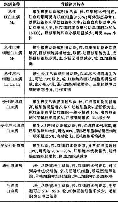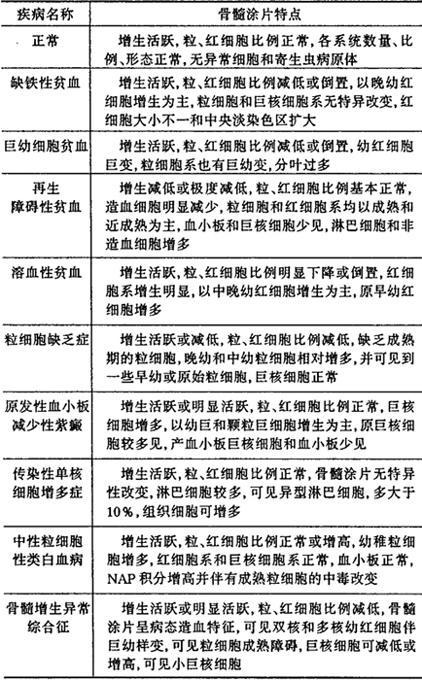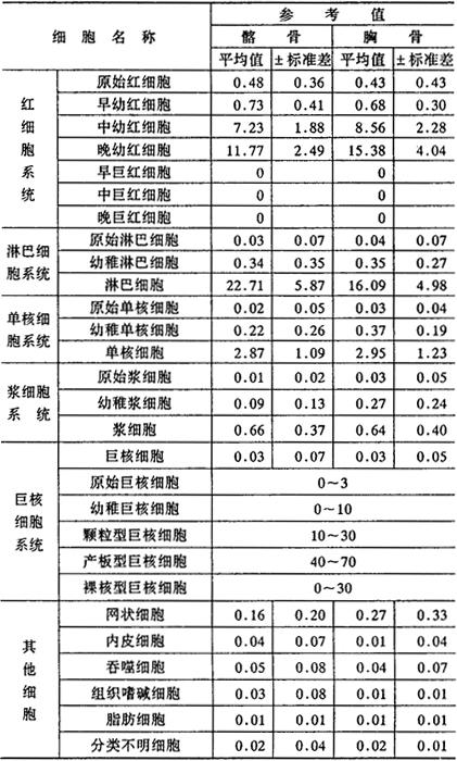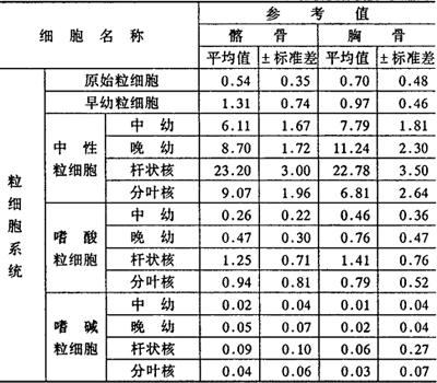 | 释义 | 骨髓细胞学检查 1.骨穿部位: 一般采用扁骨或定位穿刺,胫骨穿刺仅限于6~18个月以下婴儿。 2.骨髓取材的标准: (1)在抽取骨髓液时,病人有一种抽空样的感觉。 (2)骨髓液抽取量应在0.2~0.3ml之内。 (3)骨髓涂片上应有骨髓小粒(沙粒状)和油珠。 (4)显微镜下观察应有骨髓内特有细胞。 3.骨髓各种血细胞分类计数参考值