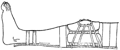 图11~29 半弧形股骨前侧板 (二)方法:闭合插钢针复位后。小腿及股部纱布绷带缠绕4层,放妥内、外、后及小腿前侧夹板,最后放股部前侧夹板,半弧形的下端抵住髌骨上缘,消除股四头肌收缩对骨折近段的牵拉力,6条布带固定于膝关节伸直位。 (三)固定时间:夹板固定4~6周,6~8周后拔出钢针。 【注意事项】 一、髌骨骨折,肿胀严重,对其分离移位常不能一次复位满意,宜随着肿胀的消减,每1~2日紧缩一次髌骨环或压缩一次钢针,要求在一周内完成复位。 二、髌骨骨折固定期间,勿作膝伸屈活动,可扶双拐下床不负重行走。 三、髌骨因无骨膜,骨折愈合主要在骨内进行,故无外骨痂形成。判断骨折是否愈合,可根据X线片上所显示骨折线的密度来判断。如骨折线模糊,说明骨折已愈合。 四、粉碎性骨折,后侧关节面多被破坏,易继发创伤性关节炎,故对45岁以上的伤员可考虑髌骨切除。 五、复位后,2~3周开始作股四头肌收缩活动。临床愈合(4~6周)后,进一步加强股四肌锻炼和膝关节活动。 六、对髌骨骨折的复位,要求解剖对位。对手法复位失败或骨折分离2厘米以上者,宜早期切开复位内固定。 【附】 髌骨骨折切开复位内固定术 以骨折线为中心,行髌骨横弧形切口,两端平髌骨内、外侧上缘各1厘米,下方平髌骨下缘,切开筋膜后,将皮瓣向上翻起,充分显露髌骨及两侧的股四头肌腱扩张部。清除关节内积血和碎骨片,在骨折块的中央,距骨折面1.5厘米处各钻一横形骨孔,用双“10”号丝线,经骨孔环绕髌骨暂不打结,术者用两把巾钳持上、下骨折段,紧密对合复位,助手拉紧丝线结扎固定(图11~30),修补缝合破裂的股四肌扩张部和关节囊,缝合切口。术后石膏托固定膝关节于伸直位,两周后拆线,换超膝夹板固定,并扶拐下床不负重活动。