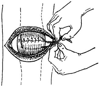 图11~30 双10号丝线固定髌骨两断段,修补股四头肌腱扩张部 |