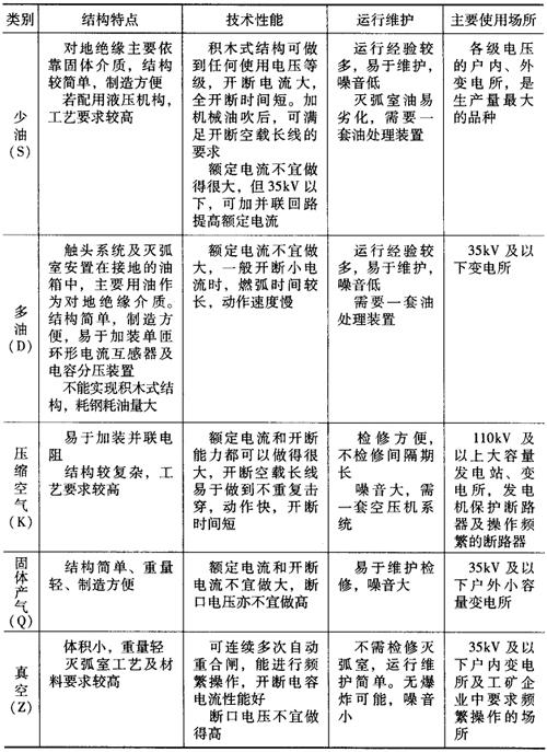 高压断路器根据其灭弧和纸绝缘介质情况可分为充油、充气、磁吹、真空等类别;按其油量可分为多油和少油两类。各类断路器的主要特点见表5-1。