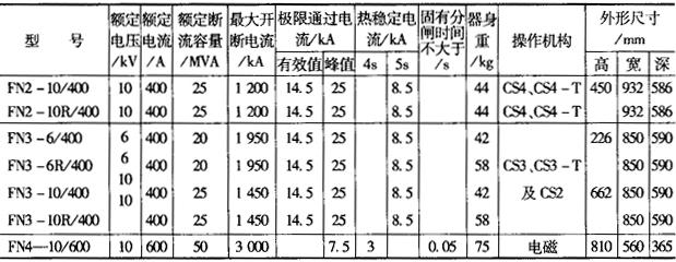 高压负荷开关分为户内型及户外型。户内型有FN2、FN3、FN4等,其中FN4型为真空式负荷开关。户外型有FW5型产气式负荷开关。该类型负荷开关一般配用CS2、CS3型手动操作机构进行操作。FN2型及FN3型负荷开关利用分闸动作带动汽缸中的活塞压缩空气,使空气从喷嘴中喷出,吹熄电弧,灭弧性能较好。 FN3型负荷开关有三种形式: (1)无熔断器的负荷开关。 (2)有熔断器的FN3-10R/S负荷开关(熔断器在开关的上面)。 (3)有熔断器的FN3-10R负荷开关(熔断器位于开关下面)。 FN4-10型负荷开关是真空式开关,具有开断电流大、真空绝缘强度高、触头开距小等优点。 FW型户外产气式负荷开关,用于户外10kV配电线路中,可开合负荷电流、电容电流及环流。装设在单杠上,三相共杆联动,用绝缘棒或线绳索操作,开关采用固体产气材料灭弧,分闸状态具有明显断口,可起隔离作用。户外产气式负荷开关有:FW1、FW2、FW4、FW5等型。 户内高压负荷开关的技术数据见表5-18。 表5-18 FN型高压户内负荷开关数据