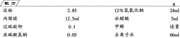 在250ml的三颈烧瓶中,加入淀粉2.85g,并在所通氮气的保护下加热至80℃,恒温30min后,淀粉即被糊化。再冷至室温,加入丙烯腈12.5ml、过硫酸钾0.1g及亚硫酸氢钠0.05g,在40℃下反应3h聚合完成。再加入12%氢氧化钠溶液24ml,在100℃下皂化2h,即得到高吸水淀粉-丙烯腈树脂。最后用冰醋酸5ml中和反应液中的氢氧化钠,使pH=7~8,再用甲醇进行沉析,再对得到的湿料在60℃下干燥,最终得到黄棕色干产品。
