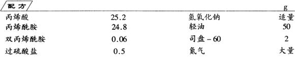在一干净的250ml四颈烧瓶中加入轻油和司盘-60,在其上安装搅拌器、温度计和氮气导管。另取一烧杯,在其中加入丙烯酸、丙烯酰胺、双丙烯酰胺、氢氧化钠和过硫酸盐,作为分散相。将分散相加入四颈烧瓶中,反应5h后出料,即得产品,产物干燥保存。
