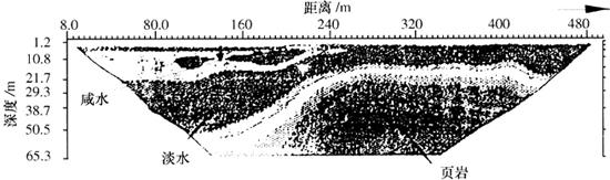 图7-1给出的是马来西亚Yansedah海水入侵调查中的高密度电阻率成像断面。剖面清晰地显示咸水、淡水、页岩基底的形态和分布特征(S.S.Abdul Nassir等,2000)。