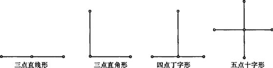 根据高层建筑的面积、形状、尺寸情况和施工场地的实际条件,高层建筑的主轴线可布置成以下几种形式,如图13-1所示。从图13-1中可以看出:无论采用何种布置形式,主轴线上的点数均不得少于3个。