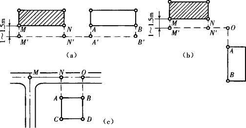 在现有建筑群内新建或扩建时,设计图上通常给出拟建建筑物与原有建筑物或道路中心线的位置关系数据,主轴线就可以根据给定的这些数据在施工现场进行测设。图13-3表示的是几种常见的情况,画有斜线的为原有建筑物,未画斜线的为拟建建筑物。