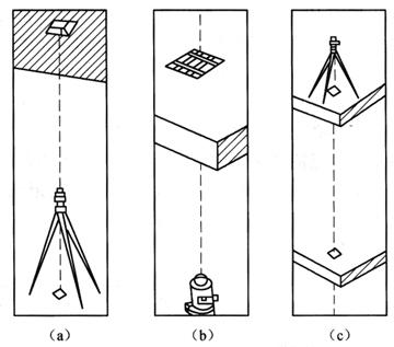 图10-48 水准仪高程传递法 4)全站仪天顶测高法 如图10-49所示,利用高层建筑中的传递孔(或电梯井等)在底层高程控制点上安置全站仪,置平望远镜(显示屏上显示垂直角为0°或天顶距为90°),然后将望远镜指向天顶方向(天顶距为0°或垂直角为90°),在需要传递高程的层面传递孔上安置反射棱镜,即可测得仪器横轴至棱镜横轴的垂直距离。将该垂直距离加仪器高,减棱镜常数(棱镜面至棱镜横轴的间距),就可以算得两层面间的高差,据此即可计算出测量层面的标高,最后与设计标高相比较,进行调整即可。