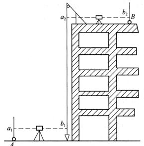 图10-47 内控法轴线投测 (a)、(b)向上投点;(c)向下投点 (4)高层建筑物的高程传递 高层建筑施工中,要由下层楼面向上层传递高程,以使上层楼板、门窗、室内装修等工程的标高符合设计要求,楼面标高误差不得超过±10mm。传递高程的方法有以下几种。 1)利用皮数杆传递高程 皮数杆上自±0.000标高线起,门窗、楼板、过梁等构件的标高都已标明。一层楼砌筑好后,则可从一层皮数杆一层一层往上接,这样就可以把标高传递到各楼层。在接杆时要注意检查下层杆位置是否正确。 2)利用钢尺直接测量 若标高精度要求较高,可用钢尺沿某一墙角自±0.000标高处起直接测量,把高程传递上去。然后根据下面传递上来的高程立皮数杆,作为该层墙身砌筑和安装门窗、过梁及室内装修、地坪抹灰时控制标高的依据。 3)悬吊钢尺法(水准仪高程传递法) 根据高层建筑物的具体情况也可用水准仪高程传递法进行高程传递,不过此时需用钢尺代替水准尺作为数据读取的工具,从下向上传递高程。如图10-48所示,由地面已知高程点A向建筑物楼面B传递高程,先从楼面上(或楼梯间)悬挂一支钢尺,钢尺下端挂重锤。监测时,为了使钢尺稳定,可将重锤浸于一盛满油的容器中,然后在地面及楼面上各安置一台水准仪,按水准测量方法同时读取a1,b1及a2读数,则可计算出楼面B上设计标高为HB的测设数据b2=HA+a1-b1+a2-HB,据此可按照测设已知高程的测设方法测设出楼面B的标高位置。