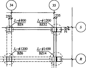 图13-4 有偏心桩的基础放线平面图 如果是在垫层上放线,可把有关轴线和边线直接用墨线弹在垫层上,由于基础轴线的位置决定了整个高层建筑的平面位置和尺寸,因此施测时要严格校核、保证精度。如果是在基坑下做桩基础,则在测设轴线和桩位时,宜在基坑护壁上设立轴线控制桩,以便能保留较长时间,也便于施工时用来复核桩位和测设桩顶上的承台和基础梁等。 从地面往下投测轴线时,一般是用经纬仪投测法,由于这种方法俯角较大,为了减小误差,每个轴线点均应盘左、盘右各投测一次,然后取中数采用。 2.基础标高测设 在基坑开挖完成后,应及时用水准仪根据地面上的±0.00水平线将高程引测到坑底,并在基坑护坡的钢板或混凝土桩上做好标高为负的整米数的标高线。由于高层建筑的基坑较深,引测时可多设几站进行观测,也可用悬吊钢尺代替水准尺进行观测。 |