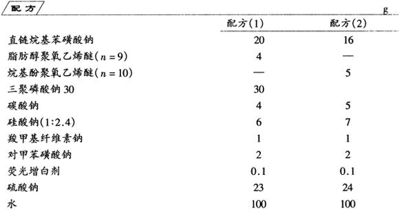 制法 按配比分别将配方(1)和配方(2)中全部物料混合,进行配料,总固体为50%~65%。经过滤、研磨、脱气制成质地均匀的料浆,再经高压泵(压力一般为40~60MPa)送至塔顶,经雾化器雾化成雾滴,对流干燥,即分别制得两种空心颗粒的洗衣粉。 |