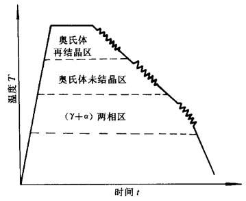 图15-42 三段控制轧制示意图 控制轧制即轧制过程分段进行,如图15-42所示轧制过程分为以下三段进行: (1)奥氏体再结晶温度(≥950℃)范围内轧制; (2)低于奥氏体再结晶温度(950℃~Ar3)范围内轧制; (3)(γ+α)两相区温度范围内轧制. 在轧制过程中,轧制温度、轧制道次、每道次的压力均由电脑控制,轧制后空冷. 这种工艺不仅可以提高钢的强韧性,还会大大降低钢的临界脆性转变温度,主要适用于含有钒、钛、铌的普通低合金钢. 15.7.2.4 高温变形热处理的强化原因 高温变形过程中,位错密度及其他晶体缺陷大为提高,变形后若能及时淬火,马氏体继承了奥氏体的晶体缺陷,并令马氏体细化,从而获得强韧化. |