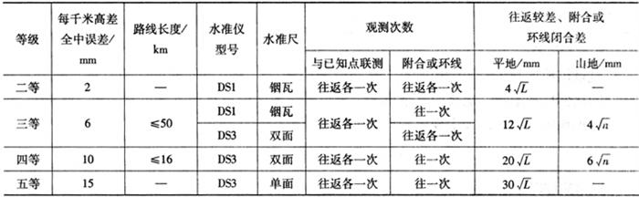 注:L为附合路线或环线的长度,单位为km。 在小区域范围内建立高程控制网,应根据测区面积大小和工程要求,采用分级建设的方法。一般情况下,是以国家或城市等级水准点为基础,在整个测区建立三、四等水准网或水准路线,用图根水准测量或三角高程测量测定图根点的高程。 |