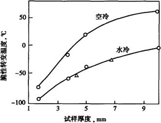 图2-43 试样尺寸和冷却速度对高纯Cr29Mo4Ni钢脆性转变温度的影响