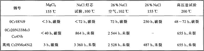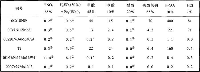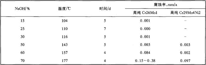 注:①均在沸腾温度。 ②试样浸入酸中呈钝态,但与铁棒相接触则不能自动再钝化。 ③与铁棒相接触也不被活化。 表2-48 高纯Cr29Mo4Ni2·Cr26Mo1在碱液中耐蚀性