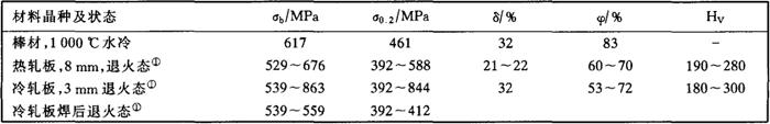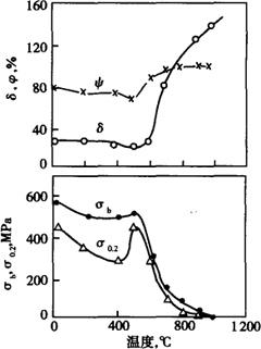 (2)物理性能 密度ρ:7.64g/cm3 线膨胀系数α:9.7×10-6/K 导热系数λ:100℃17.8W/(m·K) 弹性模量E:20~300℃时,220500~230000MPa 比热容C:20℃时,460J/(kg·K) 电阻:560nΩ·m (3)力学性能 高纯Cr30Mo2钢,其室温力学性能见表2-36,脆性转变温度曲线见图2-36。从表2-36可知,此钢具有较高的塑性。从图2-36可知,钢的脆性转变温度随板厚度增加往高侧移动,因此要求韧性的焊接构件厚度应≤6mm,如果设计6mm以上板厚,设计上应采用复合板。图2-36示出不同厚度的高纯Cr30Mo2板材的脆性,3mm冷轧落板脆性转变温度可低至-100℃以下。图2-37系此钢的高温力学性能。当高于~500℃加热时,高纯Cr30Mo2钢的强度下降,塑性(δ%)明显提高。当温度达到≥800℃时,强度很低塑性很高,进而出现超塑性现象。 表2-36 高纯Cr30Mo2钢室温力学性能