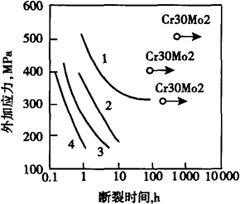 图2-38 MgCl2中(42%沸腾温度),高纯Cr30Mo2钢耐应力腐蚀破裂性 1-0Cr25Ni5Mo2;2-00Cr17Ni14Mo2;3-00Cr18Ni10;4-0Cr18Ni10