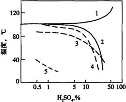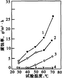 图2-40 在H2SO4中高纯Cr30Mo2钢的等腐蚀曲线(以0.18/m2·h为界限) 表2-37 高纯Cr30Mo2钢在盐酸、硫酸中的腐蚀率(g/m2K)