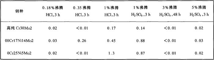 d.耐有机酸腐蚀 高纯Cr30Mo2钢具有特别优异的耐有机酸腐蚀性能(见表2-31、表2-38),对甲酸、乙酸及其混酸均显示出优异的耐蚀性,高纯Cr30Mo2优于00Cr17Ni14Mo2和0Cr25Ni5Mo。 表2-38 高纯Cr309Mo2钢在有机酸中的耐蚀性(g/m2·h)