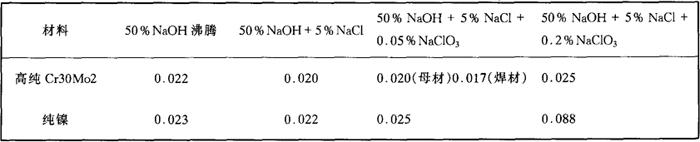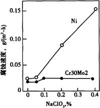 e.耐碱 高纯Cr30Mo2钢在隔膜法合成NaOH制造的浓缩工序中有着优异的耐蚀性(见表2-31),在含NaCl,NaClO3的NaOH中耐蚀性优于纯Ni(见表2-39,图2-41)。需要指出,在280℃,浓度为60%的NaOH中,只有当NaClO3浓度超过100ppm时,Cr30Mo2钢的腐蚀率才能从30~36mm/a降低到1~1.5mm/a。 表2-39 在NaOH中,高纯Cr30Mo2钢,与纯镍的耐蚀性(g/m2·h)