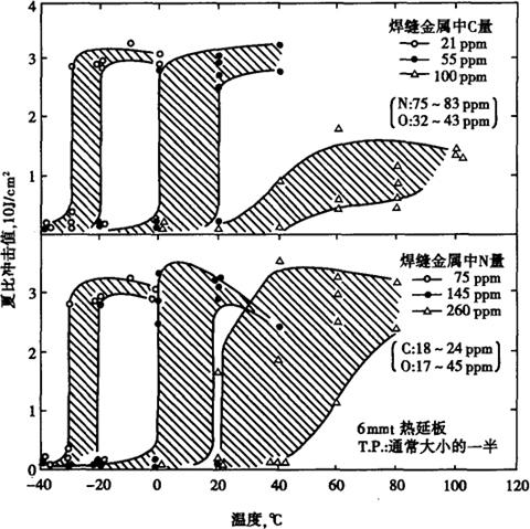 图2-41 NaClO3含量对高纯Cr30Mo2钢和纯镍耐50%NaOH+5%NaCl(沸腾温度) (5)冷热加工和热处理 高纯Cr30Mo2与高纯Cr26Mo1钢相似有极佳的热加工性能,适宜的热加工温度为870~1150℃。 高纯Cr30Mo2钢热处理为980~1020℃加热后急冷。 高纯Cr30Mo2钢冷加工硬化倾向小,深冲性好,延性小,易于冷加工,适于制造冷冲压部件。 (6)焊接性能 高纯Cr30Mo2钢可采用钨极氩弧焊和金属极氩弧焊接。当需要填充金属,可采用同样的材料。焊接时要极力防止C、N2、O2等不纯物的污染,图2-42指出焊接部分,C、N2污染程度与夏比冲击特性的关系,随着C、N2的增加韧性显着恶化。