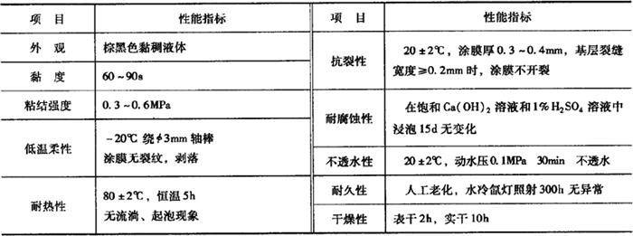 (三)亲硅快干型多功能防水涂料 1.亲硅快干型多功能防水涂料的特点 亲硅快干型多功能防水涂料,分为水溶型和溶剂型两种。水溶型涂料系以石油沥青、SBS、pH值为6的橡胶乳液为基料,以亲硅酸性脂为乳化剂制成的高聚物改性沥青防水材料。溶剂型涂料系石油沥青、SBS、烟胶片粉为基料,掺入适量催化剂而制成。 由于这种防水涂料与硅酸盐结合亲密,能直接在防水层上做装饰不会剥离,故有“亲硅”之命名。这种防水涂料成膜速度极快(在常温下仅20min)、成膜致密完整、施工效率高、无毒、无燃爆;其延伸性能好,抗基层开裂变形能力强,适应复杂的基层结构;并耐酸、耐砧、绝缘;低温、负温、潮湿环境均可施工,无环境污染。 2.亲硅快干型多功能防水涂料的适用场合 亲硅快干型多功能防水涂料适用范围十分广泛,不仅可用于不同等级、不同要求的地上、地下建(构)筑物,也可适用于道路防水工程及各种设备管道的防腐工程。 亲硅快干型多功能防水涂料的技术性能见表10-63。 表10-63 亲硅快干型多功能防水涂料的技术性能